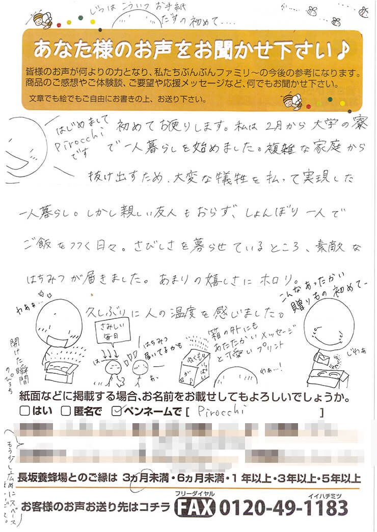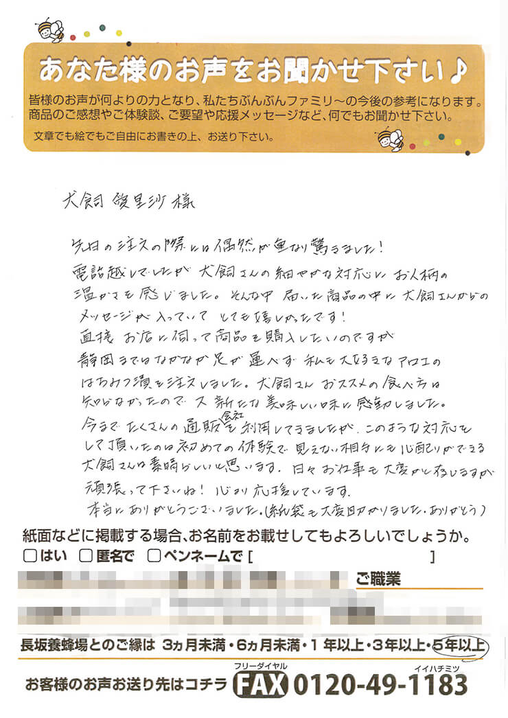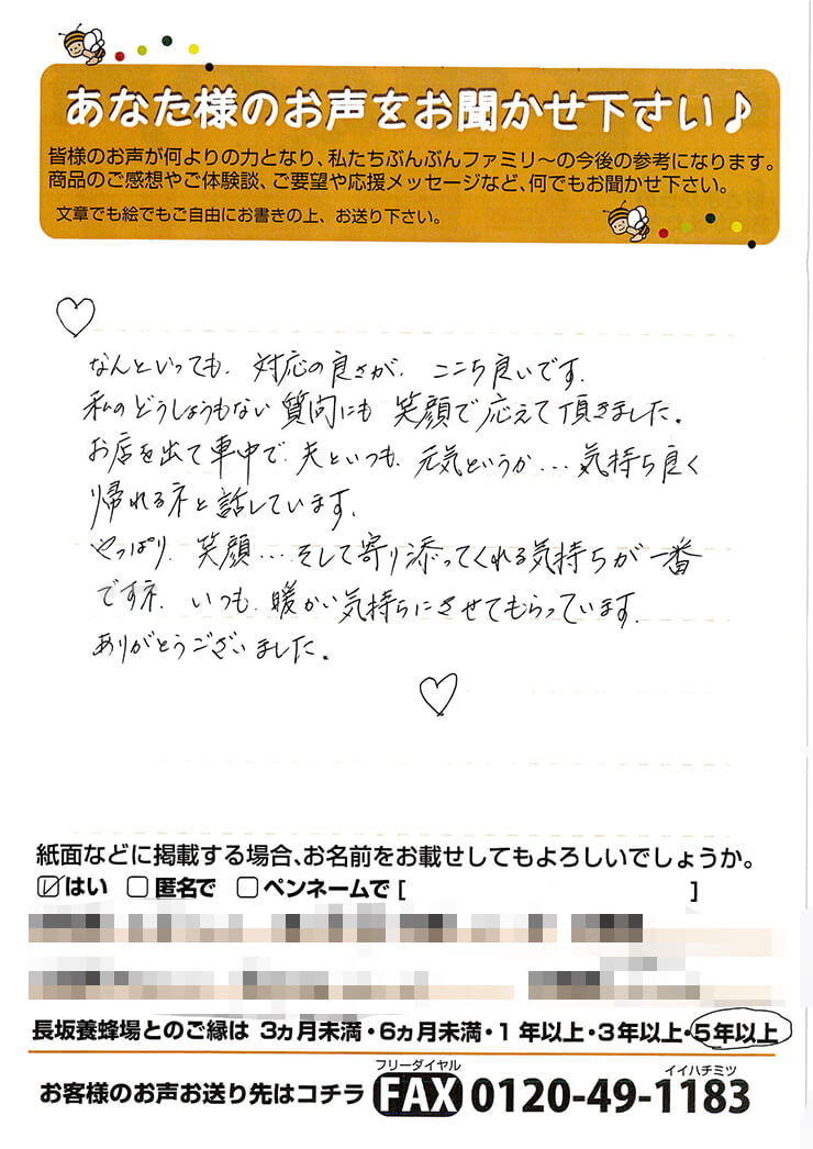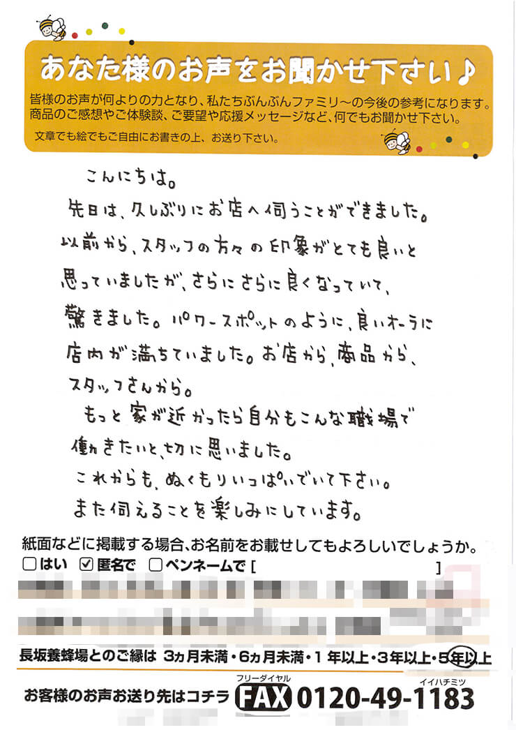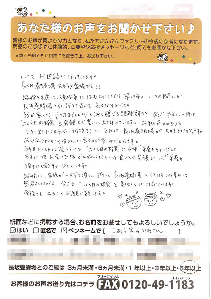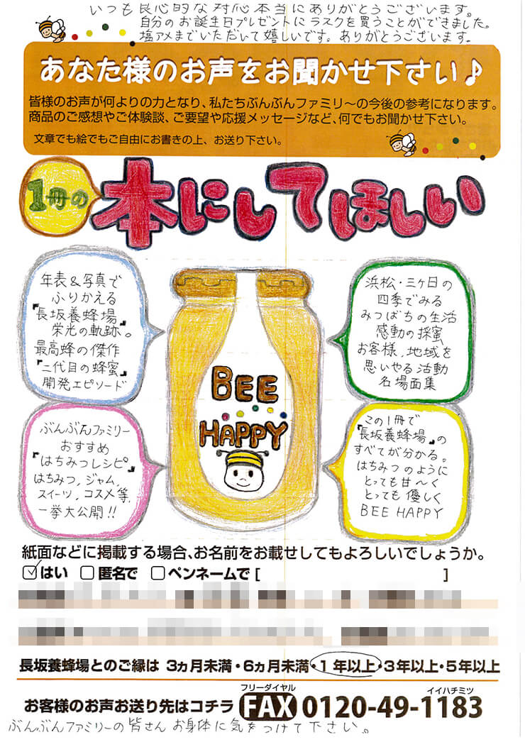 27 手間隙かけて送っていただいたタカラモノ。 お客様からのお声 ご購入いただいた商品を渡す時、お届けする時、「お客様のお声大募集」という紙も一緒に渡しています。お店や商品に関すること、ぶんぶんファミリーへの応援メッセージ、小さなお子様からはお絵かきなど、お客様から様々なお声が送られてきます。時間と手間をかけて、書いていただいたお声は、私たちにとって宝物。励みになること、時にお叱り、すべてが糧になります。そんな寄せられたメッセージの一部を紹介します。 M・H様 メイメイちゃん G・K様 S・K様 Pirocchi様 M・T様 こあら家のかあさん様